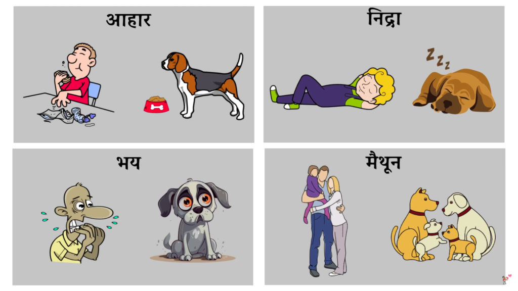 या सर्व गोष्टी मनुष्य आणि प्राण्यांत सारख्या आहेत, यामध्ये मनुष्याला भले चांगल्या सुविधा आहेत जसे – प्राणी जमिनीवर, झाडांवर मिळेल त्या जागी झोपतात तर मनुष्य मऊ गादीवर झोपत असेल, प्राण्यांकडे निवडक आहाराचे पर्याय आहेत तर मनुष्य चवी नुसार अन्न प्रश्न करतो. हे जरी असले तरी मूळ कार्यत् तर दोघांना सारखेचं आहेत.