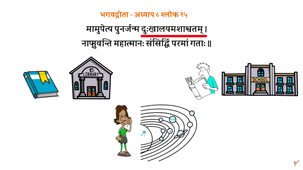 भगवद्गीता – अध्याय ८ श्लोक १५ मध्ये भगवान श्रीकृष्ण अर्जुनाला उपदेश करताना या भौतिक जगाला “दु:खालयमशाश्वतम्” संबोधतात.