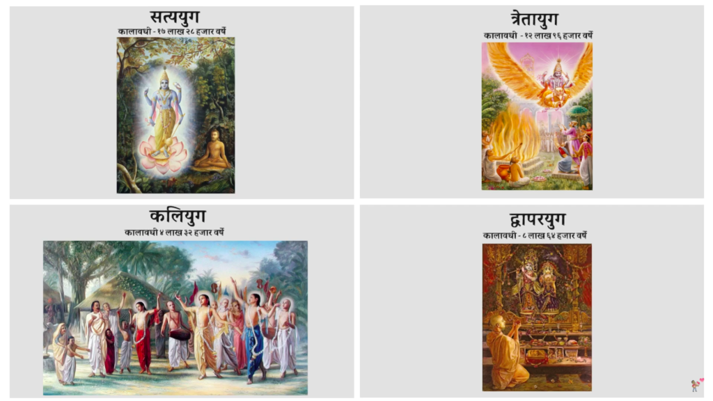 कलियुग – आता आपण कलियुगामध्ये आहोत आणि या कलियुगाचा कालावधी ४ लाख ३२ हजार इतका वर्षे इतका आहे, ह्या कलियुगात जेथे अधर्म सर्वात जास्त आहे जेथे मनुष्य खूप आळशी आहे जेथे खूपच दुर्मिळ लोकांना भगवद्दामप्राप्ती होते; अशा या युगामध्ये आत्मसाक्षात्काराचा मार्ग म्हणजे भगवंतांच्या पवित्र अशा नामाचे उच्चारण.