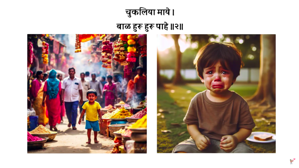 ज्याप्रमाणे एखाद छोट मुलं आई जेव्हा त्याच्या नजरेआड होते तेव्हा ते इतरत्र कावरेबावरे होऊन आईला शोधत असते, त्याप्रमाणे तुकाराम महाराजांची अवस्था हि त्या लहान बाळासारखे झाली जे आपल्या आईपासून कदापि वेगळे राहू शकत नाही.